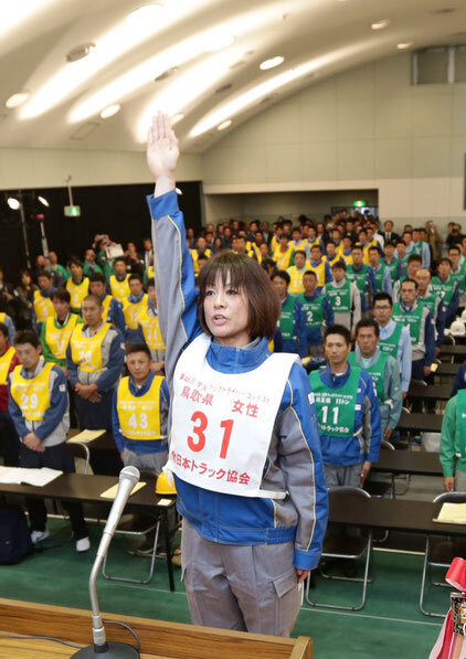 先進国の中でも遅れているとされていた、日本における女性の活躍。労働力不足を背景に、今や国を挙げて女性の力に頼る時代がやってきた。物流業界も女性が輝ける産業になれるか否かが問われている。写真は昨年10月、全日本トラック協会ドライバーコンテストの開会式で、選手宣誓する森田泰子選手(全日本トラック協会提供)。