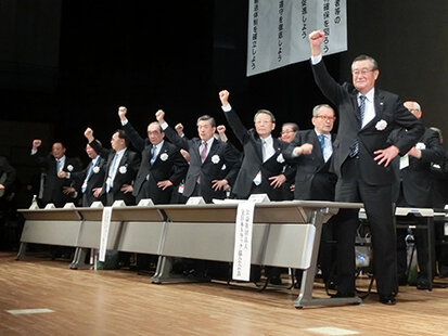 星野会長(前列右端)らによるガンバローコール
