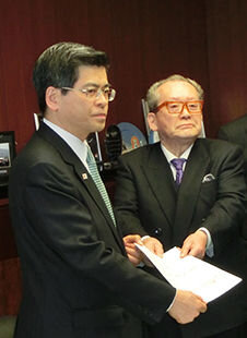 石井大臣(左)に要望書を手渡す坂本副会長(右)
